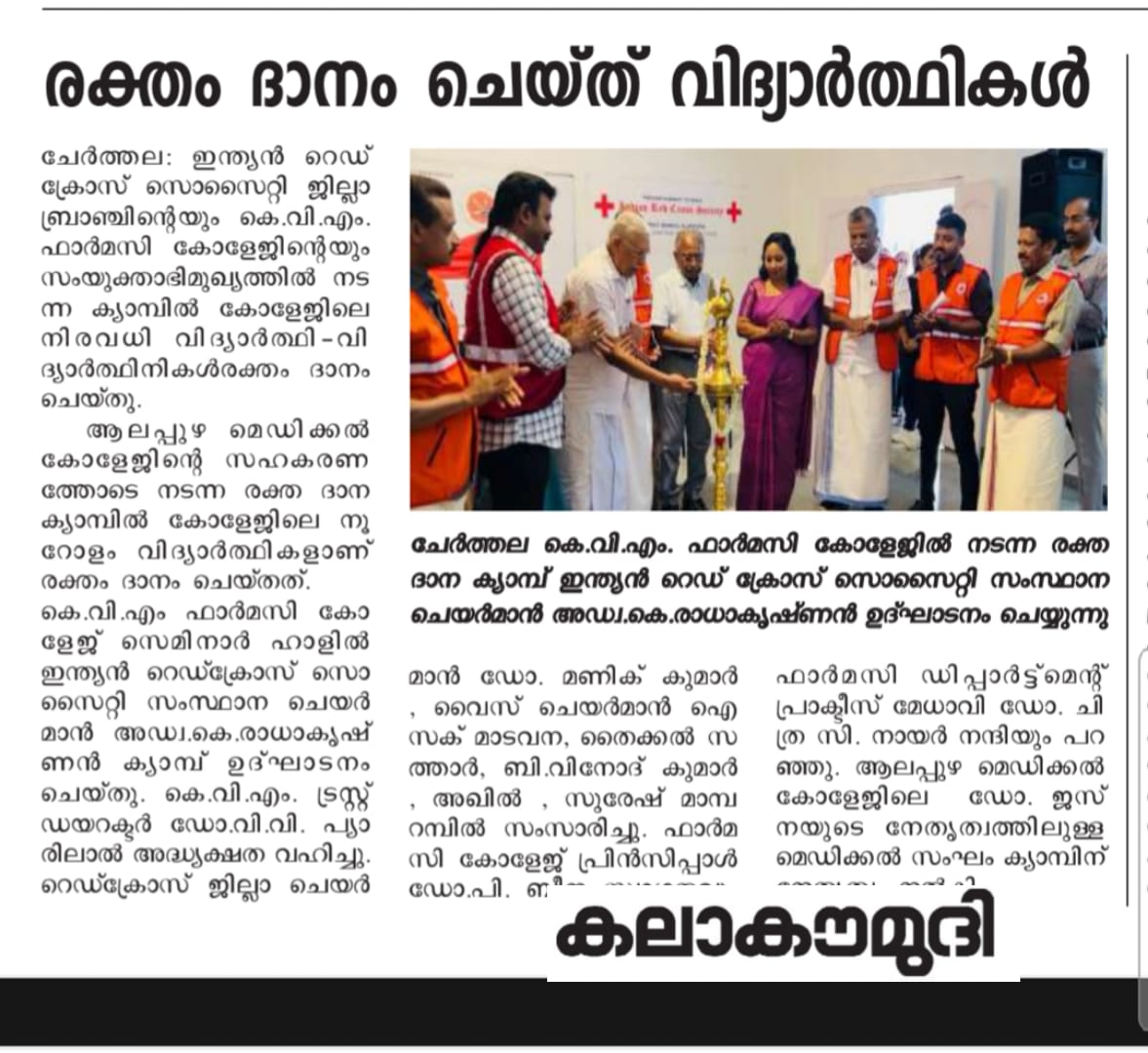 Kvm college of pharmacy cherthala and District Red cross society, Alleppey in association with Nss unit and Department of pharmacy practiсе, KVMCP organized Blood donation camp on 11th December 2023. At seminas Hall KVMCP. The programme Starts at 10:30 am with prayer of song and Dr. Beena P Principal kvm college of pharmacy Welcomed the ceremony. The presidential Address was given by Dr.V V Pyarelal,Director KVM Trust . Adv. R Radhakrishnan ,Chairman IRCS Kerala state Inaugrated the ceremony. Dr. Manik kumar, Mr. Issac Madavana, Mr. Thaikkal sathar,Mr.B Vinod Kumar Mr. Suresh Mamparambil shared Felicalation to the programme. Dr. Chitra.C. Nair shared Vote of thanks for the programme.